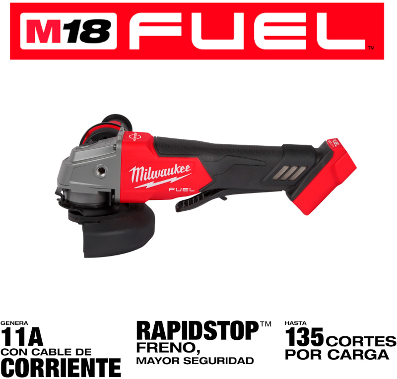 - La esmeriladora Angular M18 Milwaukee con interruptor de paleta sin bloqueo es el siguiente avance en potencia y rendimiento, ya que genera 11 A de potencia con cable, cortes más rápidos y ofrece hasta 135 cortes por carga. Apta para discos de 4-1/2 y 5 Pulg. El motor sin escobillas POWERSTATE ofrece la máxima energía constante y 8,500 RPM para retirar material más rápido y aumentar la productividad.